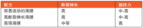 厚度如圖所示,幅寬為500mm的收縮膜采用同樣的工藝參數進行加工。配方中的拉伸和握持力有差異,以反映商業用途的需要(表1)。陶氏聚乙烯薄膜如Elite AT 6111(采用Elite AT技術加工成的乙烯-辛烯共聚物)滿足了高性能薄膜的要求。