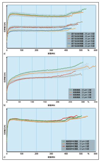 不同層結構的薄膜的斷裂伸長率或握持力沒有發現有顯著的差別。將握持力與薄膜厚度相對應,進行標準化,得到了依厚度變化的曲線,這樣,具有不同厚度的薄膜可以直接進行比較。不同層結構的高斷裂伸長率的薄膜也沒有顯著的差異(6c)。