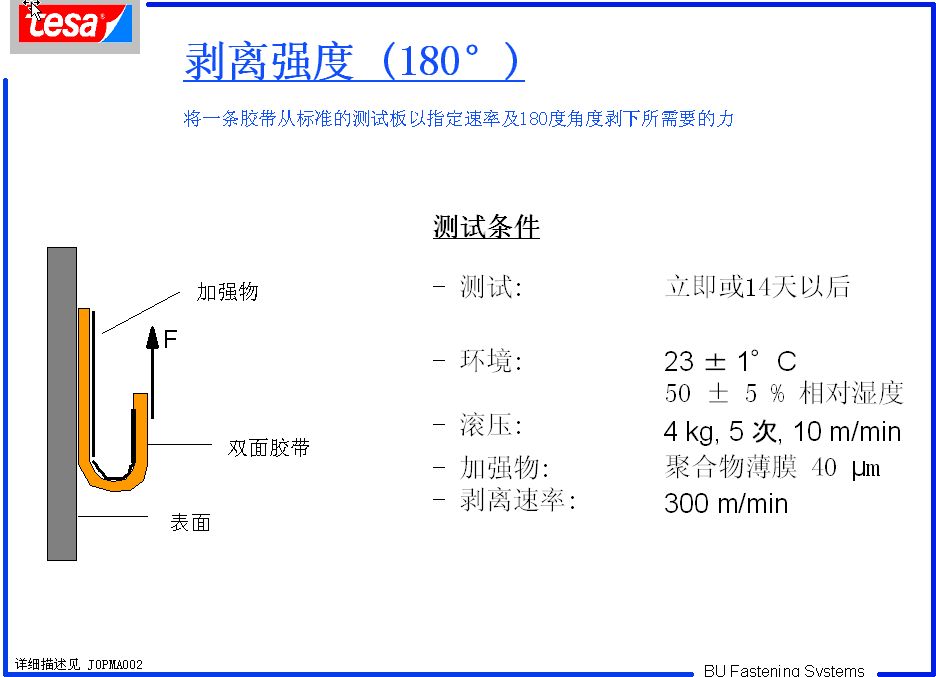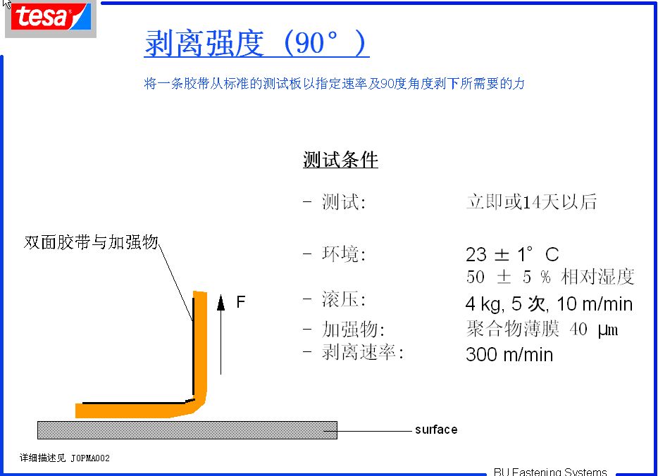 1)取25.4mm 寬、200mm 長的TESA 7475 膠帶貼于膜的測試面(離型面),并用2KG 標準碾壓手輥碾往復碾壓3次。(注意:要一邊貼全一邊碾壓,避免貼膠帶時于離型膜之間有氣泡;2)貼好膠帶后靜置20 分鐘,實驗室的溫濕度分別控制在23±2℃及50±5%;