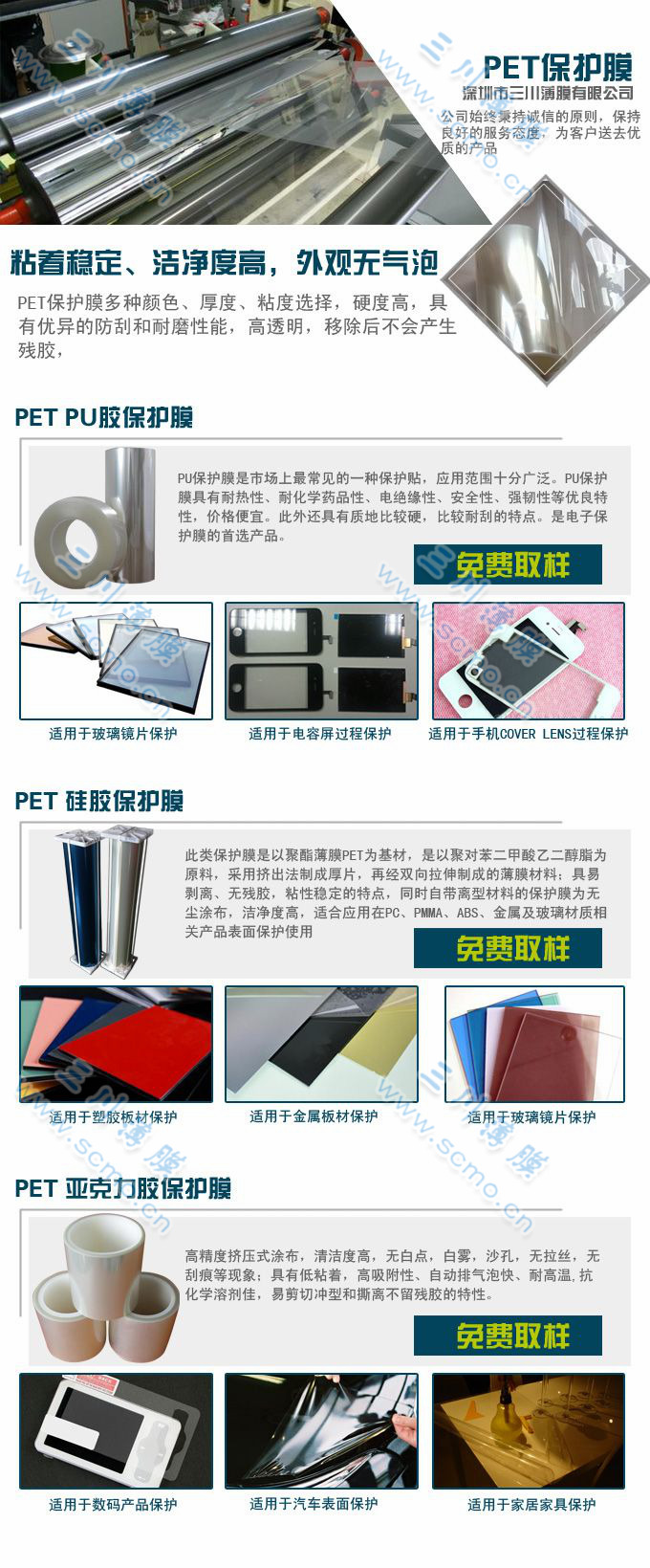 一.特性PET保護膜是乳白色或前黃色高度結晶性的聚合物,表面平滑而有光澤。耐蠕變、抗疲勞性、耐摩擦和尺寸穩定性好,磨耗小而硬度高,具有熱塑性塑料中最大的韌性;電絕緣性能好,受溫度影響小,但耐電暈性較差。無毒、耐氣候性、抗化學藥品穩定性好,吸水率低,耐弱酸和有機溶劑,但不耐熱水浸泡,不耐堿。